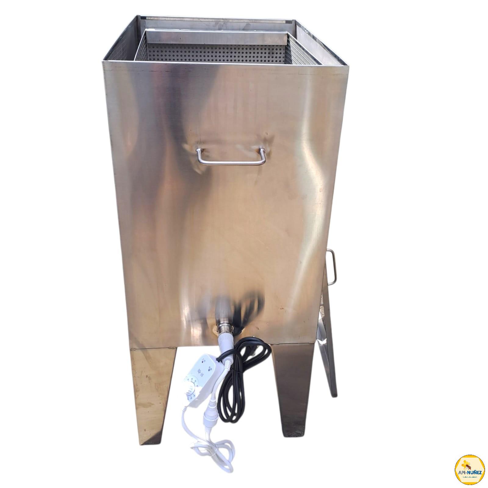 El Fundidor de Cera o Marcos API-NUÑEZ está diseñado para facilitar el proceso de recuperación de cera en marcos usados, mediante calentamiento eléctrico controlado. Fabricado íntegramente en acero inoxidable, garantiza durabilidad, resistencia a la corrosión y fácil limpieza. Su calentador eléctrico con regulador permite ajustar la temperatura de manera precisa para optimizar el derretido sin dañar la cera ni los marcos. Su canastillo interno permite procesar hasta 15 marcos por ciclo, lo que lo convierte en una herramienta eficiente para apicultores.