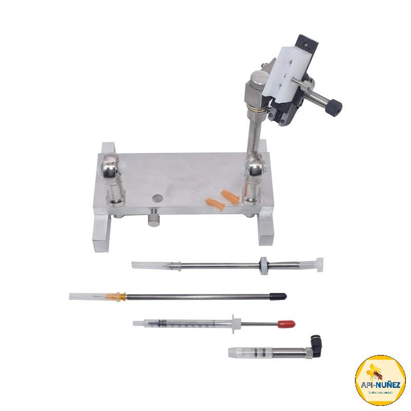 - 1 Instrumento de inseminación artificial: Estructura principal fabricada con materiales de alta durabilidad y precisión, que permite la correcta sujeción y manipulación de la reina durante el procedimiento.