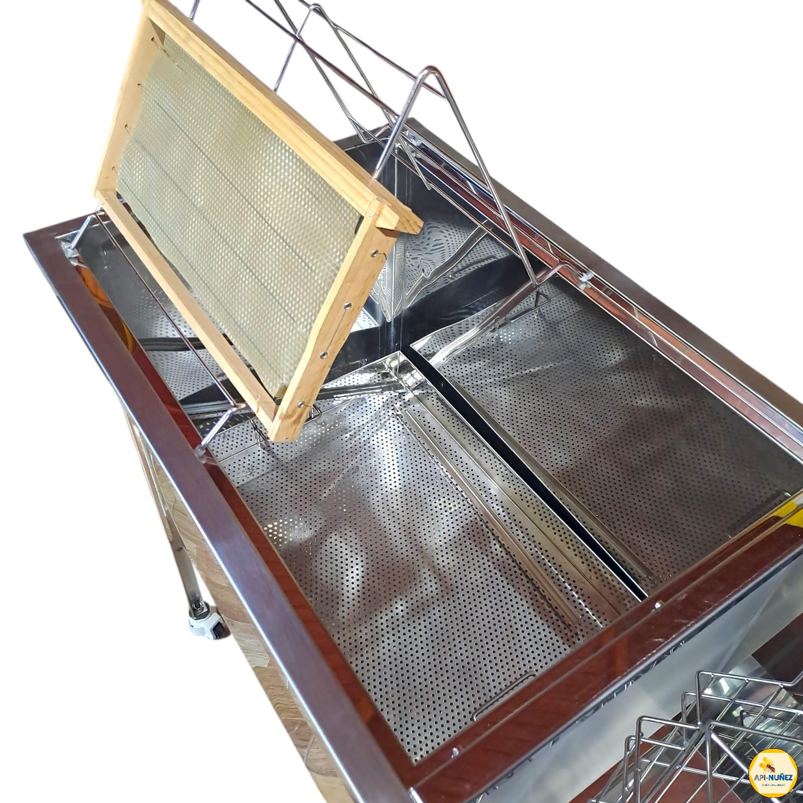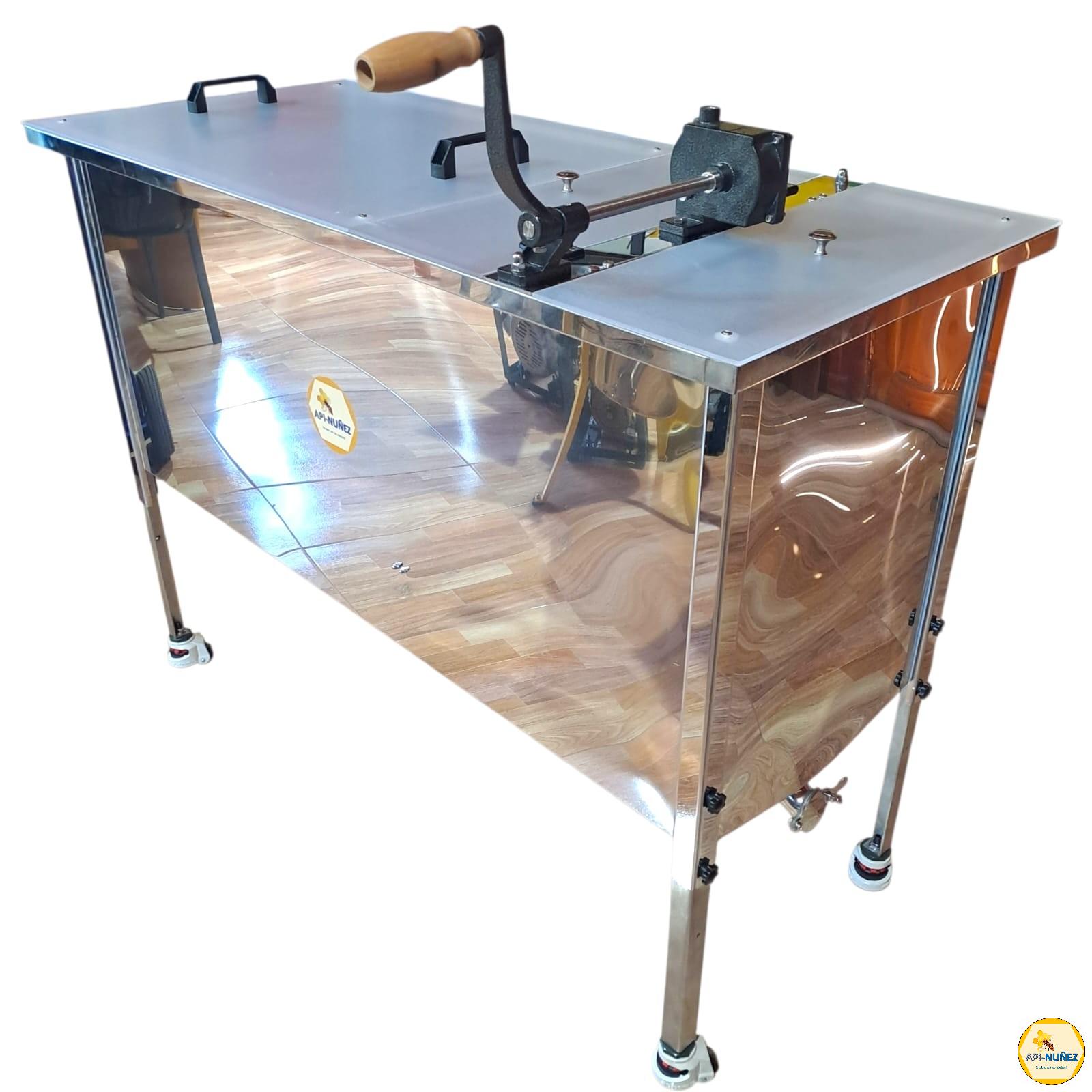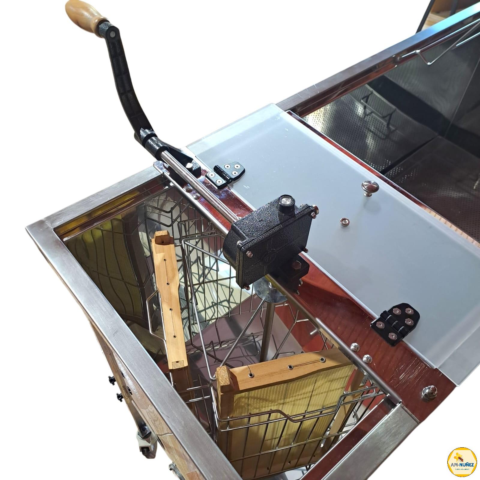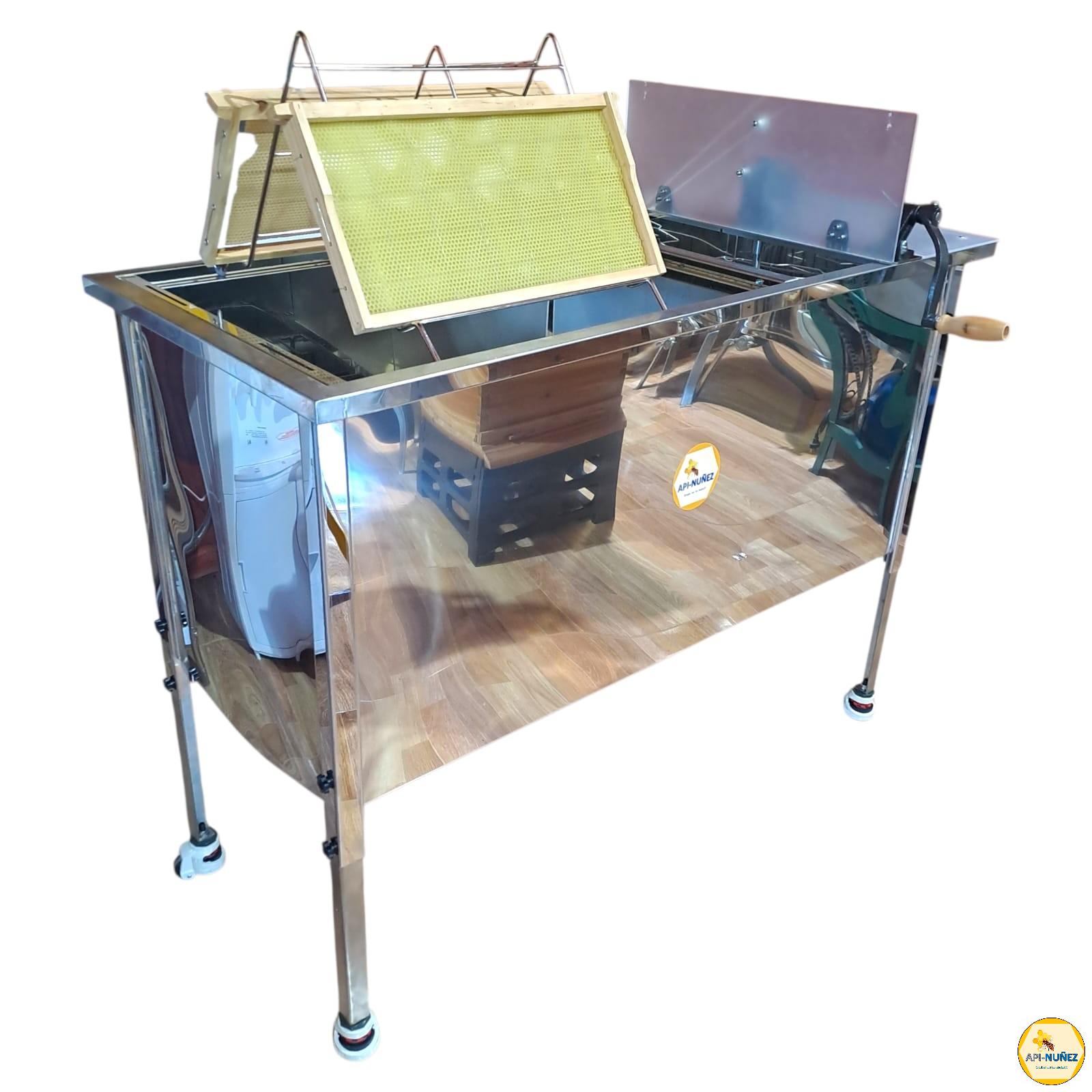 La batea apícola desoperculadora de 1,20 metros con centrífuga manual integrada para 4 marcos api-nuñez es un equipo diseñado para optimizar el proceso de desoperculado y extracción de miel en explotaciones apícolas pequeñas y medianas. Fabricada íntegramente en acero inoxidable 304, garantiza una alta durabilidad, higiene y resistencia a la corrosión, cumpliendo con los estándares alimentarios.