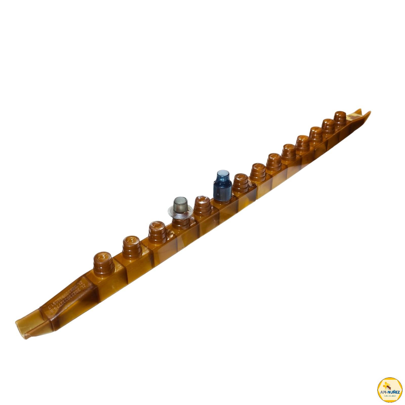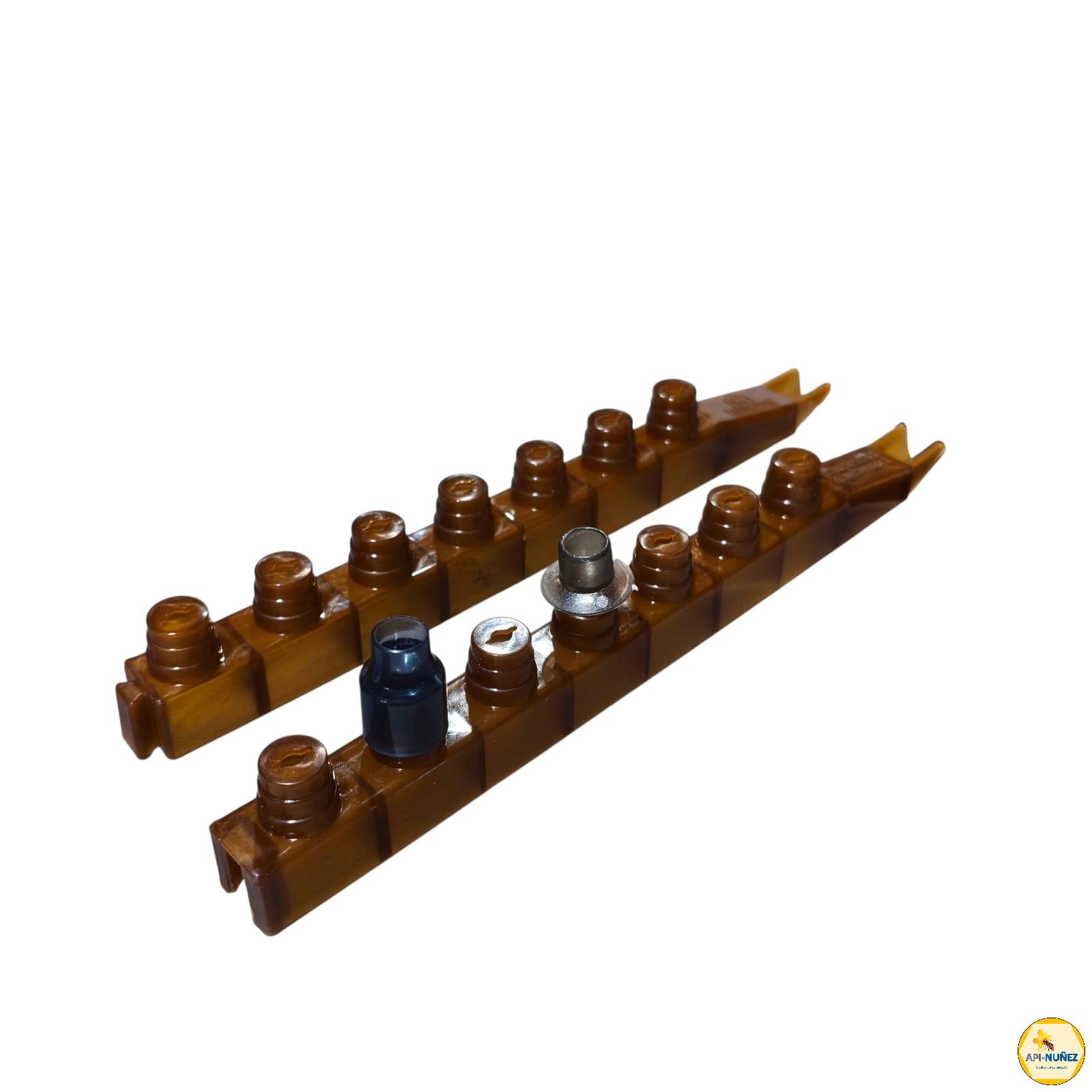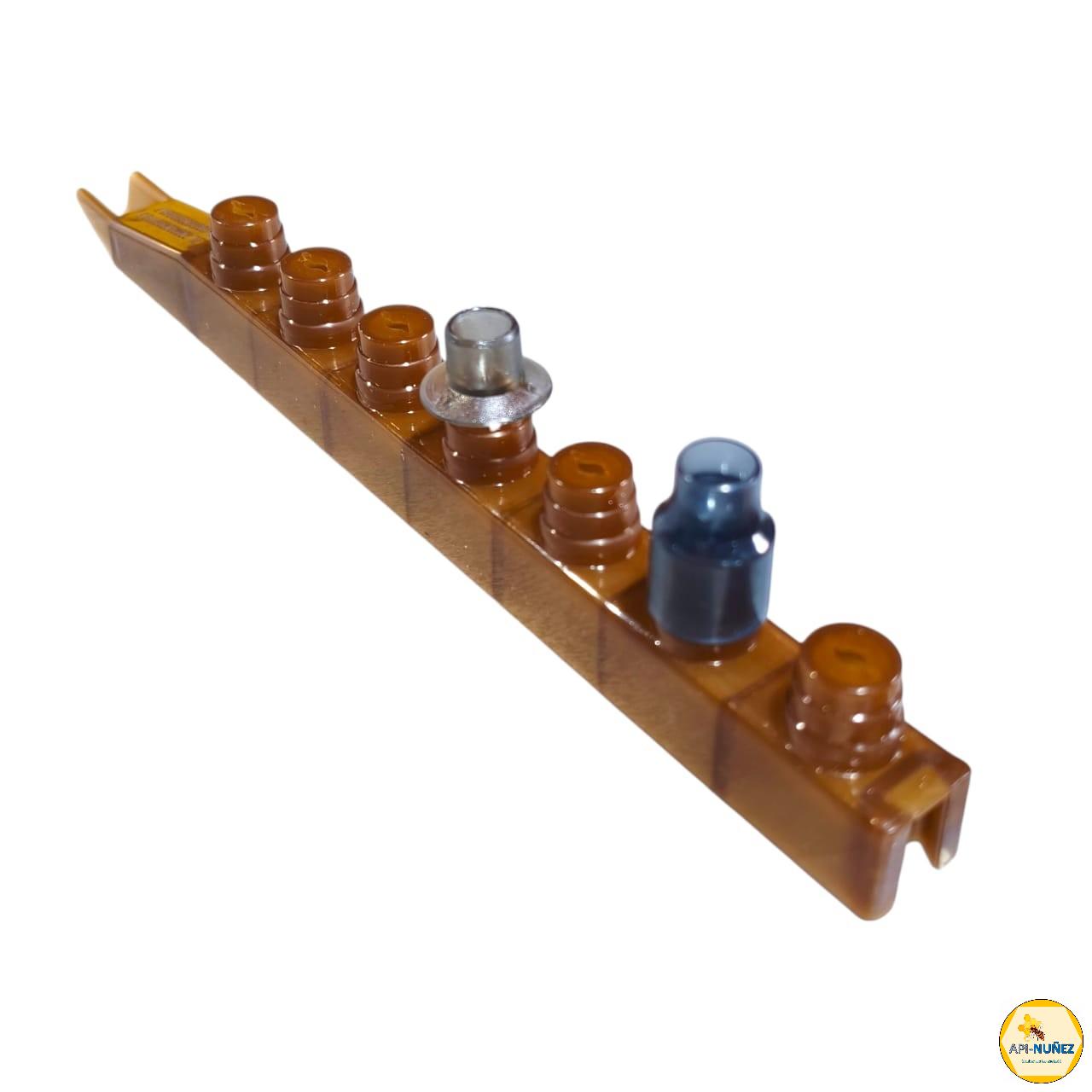 La barra porta cúpulas de reinas de material plástico está fabricada con plástico resistente y duradero, lo que garantiza una larga vida útil y facilidad de limpieza. Su estructura liviana permite manipularla cómodamente dentro de los cuadros de cría.