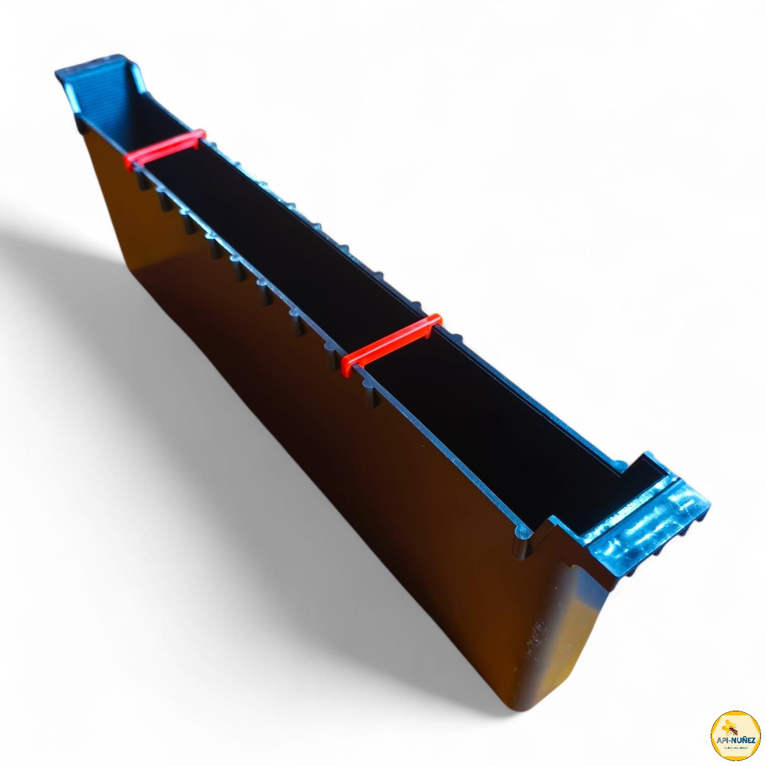 Un alimentador apícola de plástico es un accesorio diseñado para suministrar alimento líquido (como jarabe de azúcar) a las abejas de forma segura y eficiente dentro de la colmena.